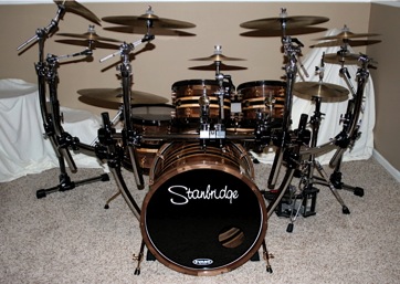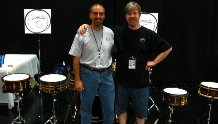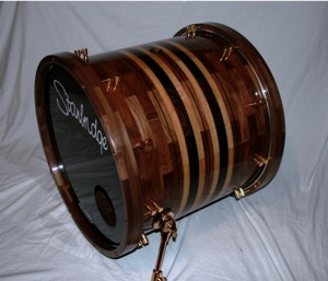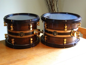 Here are a few shots of the glorious 5 piece version of the Walnut, White Oak and African Blackwood drumkit. Unveiled in Nashville at the Southern Drum Show, our client Mark (on the left, above) flew in for his first date with the new drums. With beautiful round sounding rack toms, a floor tom which rumbles for days, and a kick drum that even punched through the din of a roomful of Ringos, this kit drew a lot of attention and accolades. The complete rig will include an 8 inch rack, two more floor toms, and a big bad Gong tom for good measure. More photos to follow....