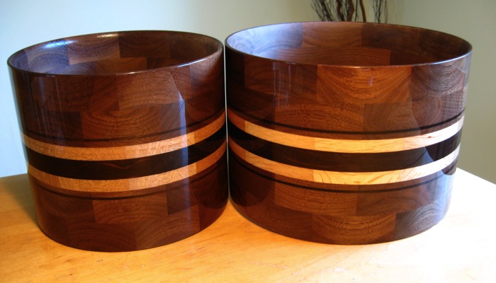 Here are the 10x8 and 12x8 inch tom shells for one of our current Drum Kit projects, awaiting hardware, hoops, and quite a number of other playmates. The completed kit will consist of 9 drums in total...