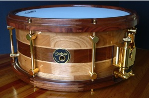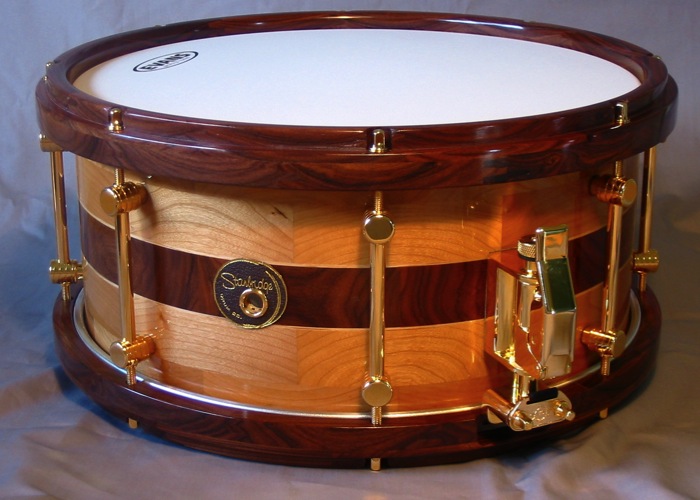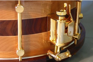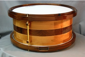 Cherry and Pau Ferro is a really nice combination of materials, and I have used them together on a number of projects. As the majority of this drumshell is Cherry, the instrument has an even, full-range voice which is very smooth and versatile. The dynamic grain figure and bright tonality of the Pau Ferro center section provides a beautiful accent both visually and audibly, and further compliments the Pau Ferro hoops.