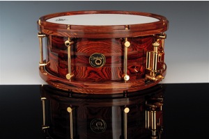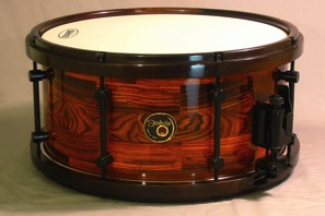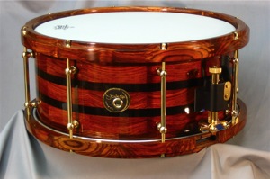 This is a particularly nice example - a 14 by 6.25 inch Cocobolo with a pair of subtle Pau Ferro stripes in the shell which are also mirrored in the hoops. The voice is rich and complex and the drum speaks with authority at all dynamic levels.