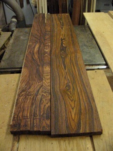 The finish is an open pore French Polish which I like for projects where we are trying to achieve a warm looking semi-high-gloss sheen. Another approach would be to use a rubbed oil, however Cocobolo tends to shift to a deeper brown color under oil, while the alcohol based shellac in the French Polish process keeps the vibrant red and orange tones bright.