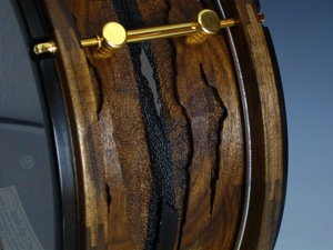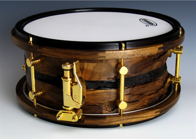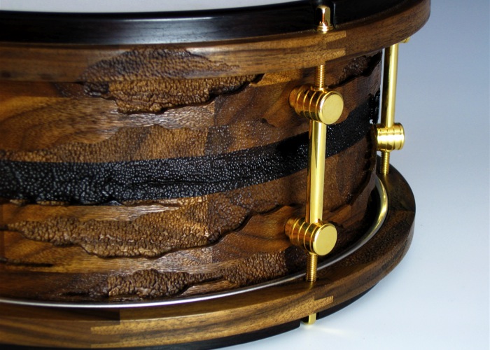 John uses a variety of tools to create this effect, but the majority of the wood is painstakingly removed by hand with a tiny dental drill. To create the illusion of layers in the piece John undercuts the surface of the wood and employs several different textures and treatments. Both the drum and hoops are finished in a rich satin oil varnish, and hardware is 24K gold. Check out his website to see more of his work.