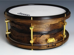 This spectacular instrument is the result of a collaboration with sculptural artist and good friend John Goodyear. John has been exploring an interesting organic erosion motif in his wood art, and we both felt that it would lend itself well to the large canvas of a drum shell.