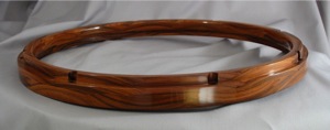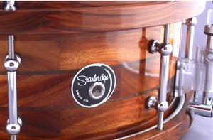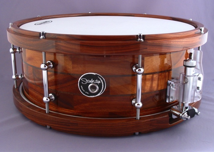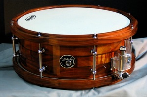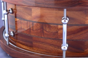 The rippled figure in the center band of this drum shell is quite three-dimensional in real life, and displays a very pronounced grain flicker as you circle the drum. I set off the center section with two thin bands of Walnut which I thought would add a little visual interest and echo the color of the Pau Ferro hoops.