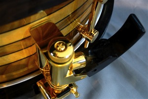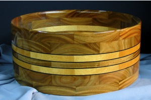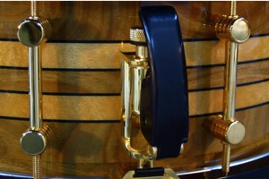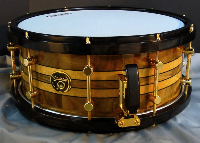 In consultation with our client, I designed an interesting Pau Amarello double stripe pattern with thin black pinstripes to tie the shell and hoops together. The high gloss lacquer, 24K hardware, and a hand carved throwoff handle are fitting on this full dress Cadillac I think. A bright, full projection and lots of sizzle to the cross-stick make this a personal favourite.