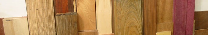 From the left we have figured Walnut, Pau Amarello, Padauk, Bubinga, Jarrah and Paela wood.