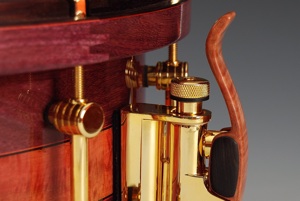 I hadn’t worked with Pink Ivory wood before, and had never even heard of Curly Pink Ivory until I came across an auction for several small but beautifully figured blocks. I snapped these up and made good use of the few cubic inches we had available. This drum also include some challenging details like the black and pink stripes which go completely through the shell and hoops. I carved the Pink Ivory and Ebony handle to a sleek and curvaceous profile, and built the hoop topsides out of Indian Rosewood for its durability and sheer sexiness.