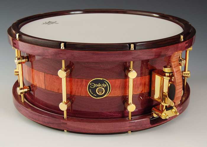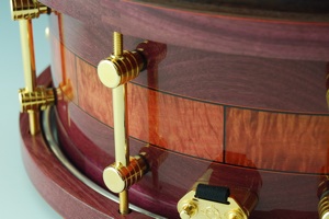 I’m incredibly fortunate to have developed a friendship with Todd Sucherman of Styx, whose combination of blazing chops, fluid motion, and sheer musicality make him one of the finest drummers on the planet. An avid snare drum collector and wood aficionado, Todd is also a warm and generous human being, and we have worked together on a number of projects. So, when he called looking for something purple and cool with 10 lugs, I really wanted it to be a museum piece. We decided to pair Purpleheart with something else spectacular, but it took almost a year of ‘waiting for the muse’ to finalize this design.