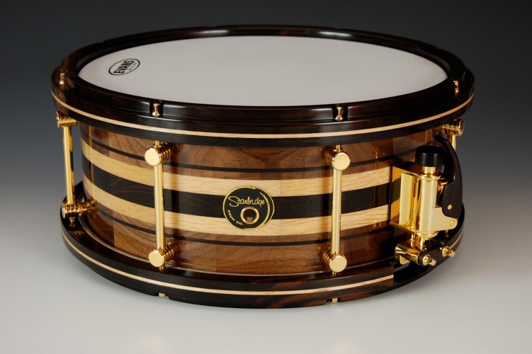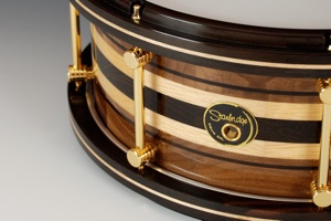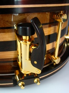 This 14 by 6 inch snare drum is an instrument I truly love to look at and hear. The drum shell is comprised of Walnut, White Oak and African Blackwood, and the hoops are solid finger-jointed Blackwood with Oak pinstripes inlaid in precisely cut grooves. The finish is our UV cure high gloss lacquer with a pebbled lacquer applied inside for a warmer tone. The drum features a hand carved Blackwood strainer handle, knob and strap plate, and 24K gold-plated hardware.